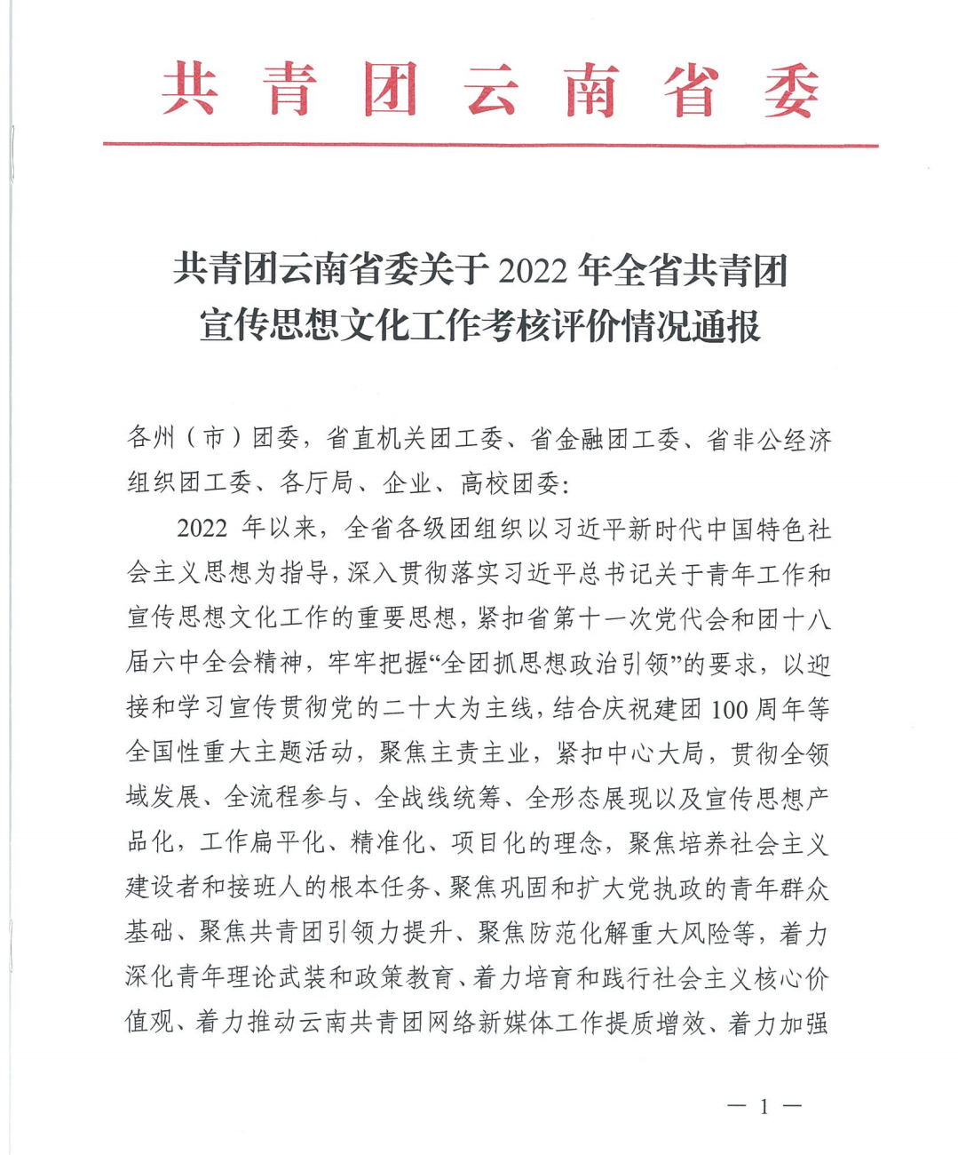 2022年,J9国际站登录控股公司团委紧紧围绕迎接和学习宣传贯彻党的二十大精神这一工作主线,聚精会神抓好首要任务,认真开展“喜迎二十大、永远跟党走、奋进新征程”主题实践活动,回顾党领导青年运动的光辉历程,把握好共青团在党的领导下团结带领一代代青年跟党奋斗的责任使命。J9国际站登录控股公司团委把青年工作和共青团工作的亮点、特色宣传放进全年工作重点任务中去,把青年成长成才情况、主题活动成果、建功立业事迹等展现在各类宣传媒体平台。树立了产品化思维,守住宣传思想文化阵地,做好对内宣传,抓好对外宣传,找准切入点讲好J9国际站登录团青故事。保质保量完成为党的二十大胜利召开营造氛围和学习宣传贯彻大会精神的工作任务。共青团云南省委2022年全省共青团宣传思想文化工作考核评定等级有“优秀”、“良好”、“一般”3个等级,厅局、企业团委评定占比分别是20%、60%、20%,J9国际站登录控股公司团委被评定为“优秀”等级。