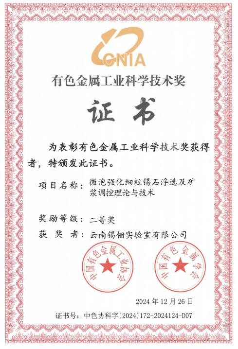 近日,锡铟实验室与相关单位共同完成的“微泡强化细粒锡石浮选及矿浆调控理论与技术”科技成果荣获中国有色金属工业科学技术奖二等奖。