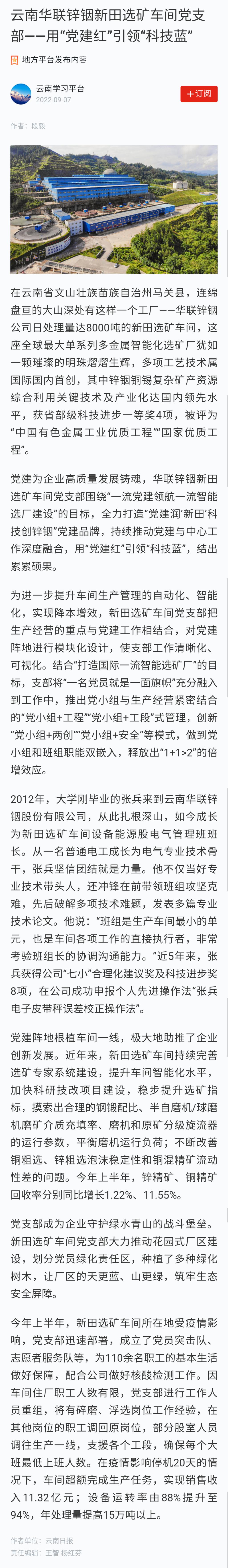 学习强国:云南华联锌铟新田选矿车间党支部——用“党建红”引领“科技蓝”