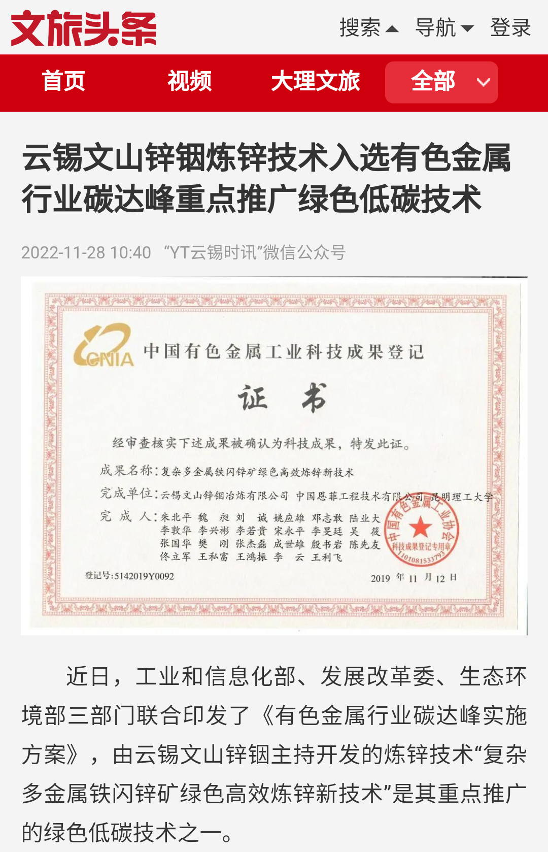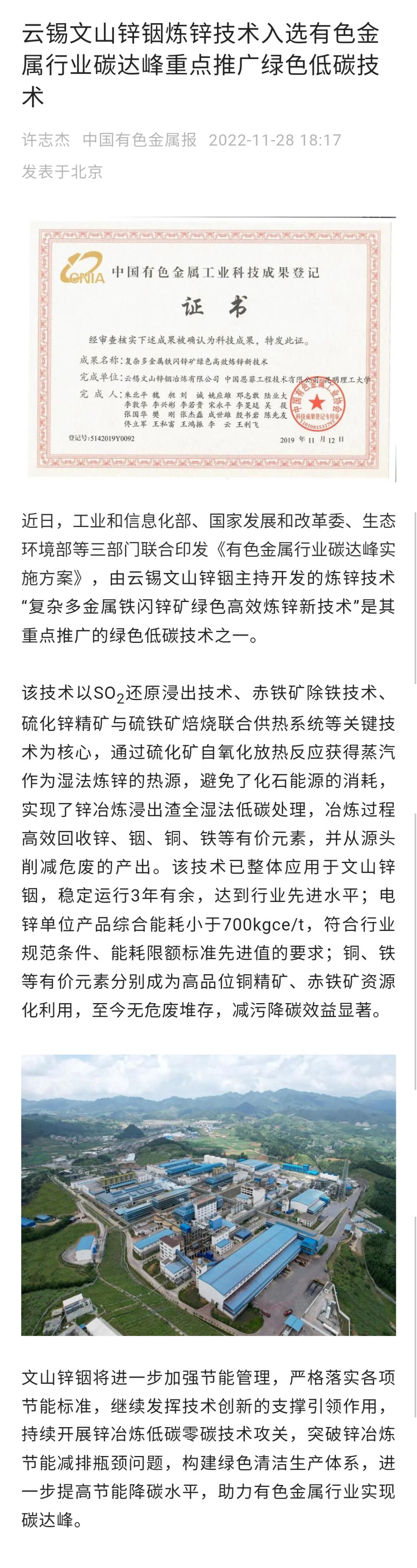 中国有色金属报、文旅头条:J9国际站登录文山锌铟炼锌技术入选有色金属行业碳达峰重点推广绿色低碳技术