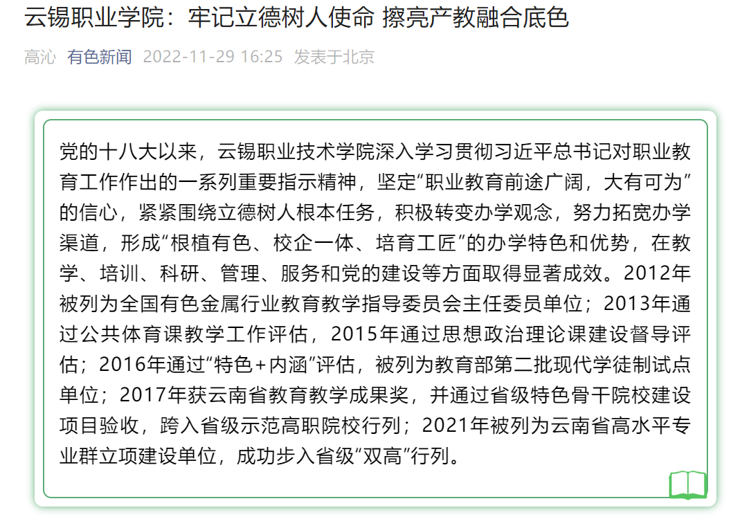 中国有色金属报、有色新闻:J9国际站登录职业学院牢记立德树人使命 擦亮产教融合底色
