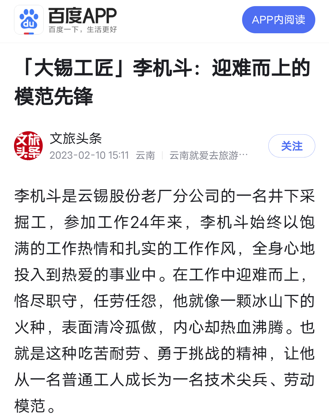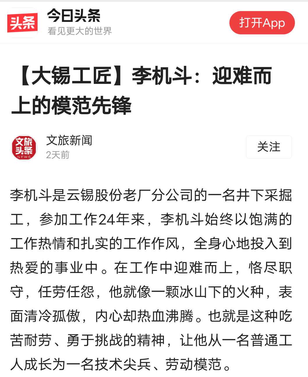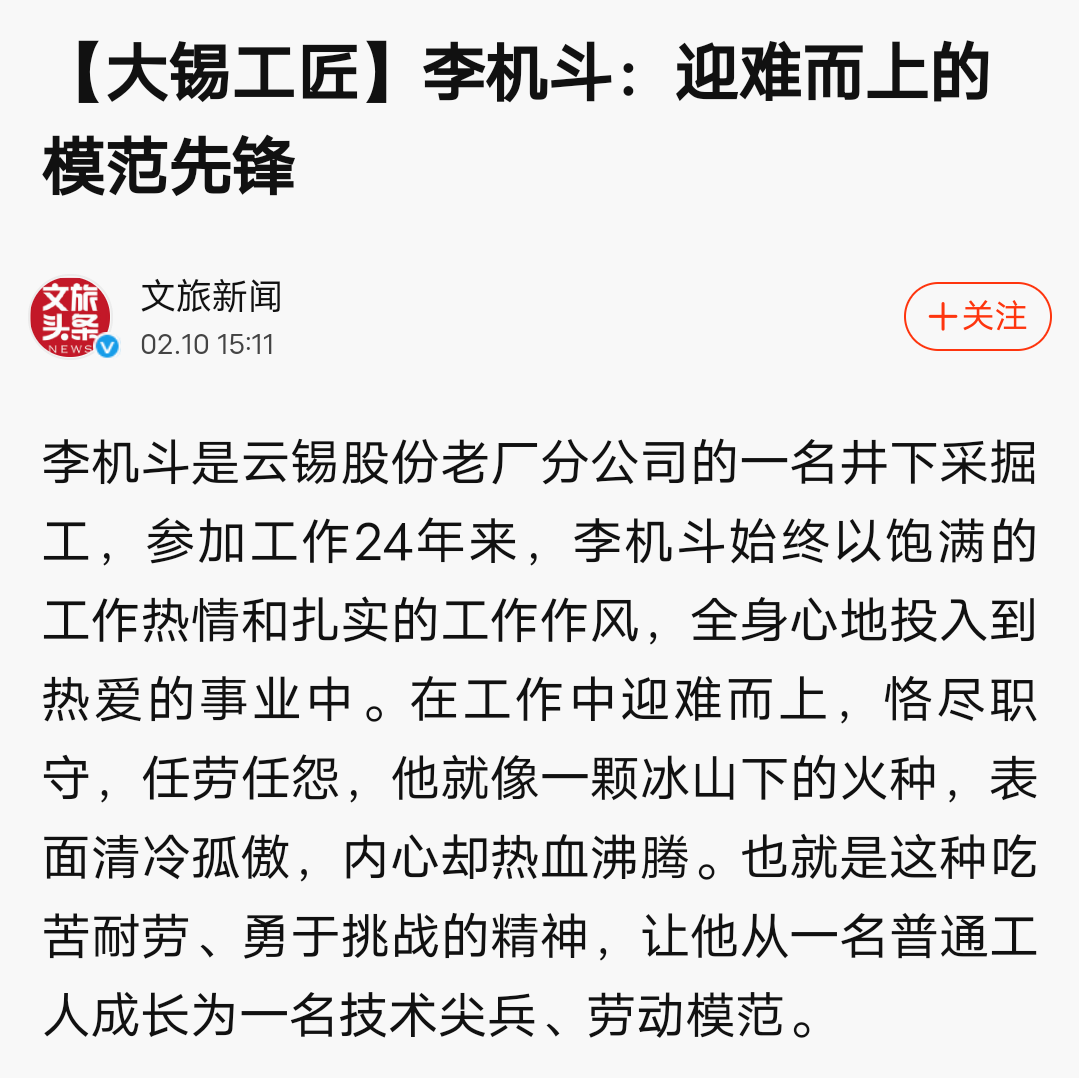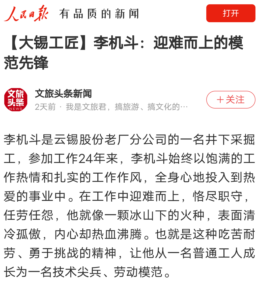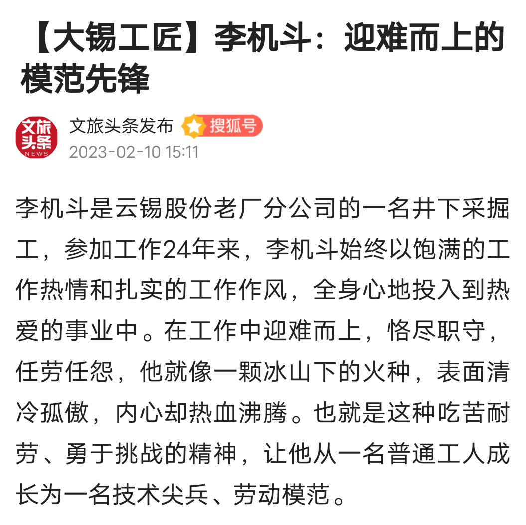人民日报、百家号、今日头条、搜狐号、一点资讯、新浪看点、文旅头条:【大锡工匠】李机斗:迎难而上的模范先锋