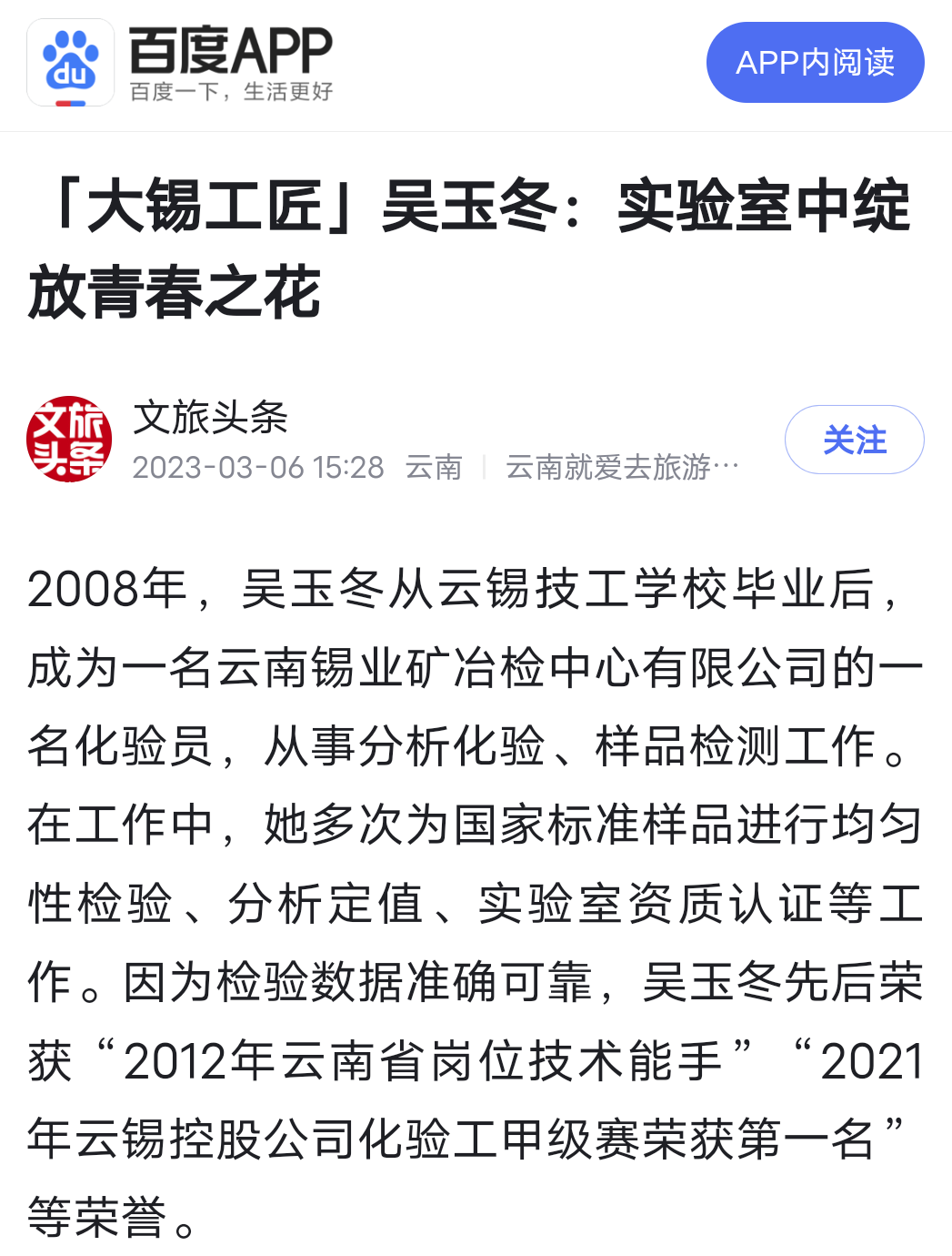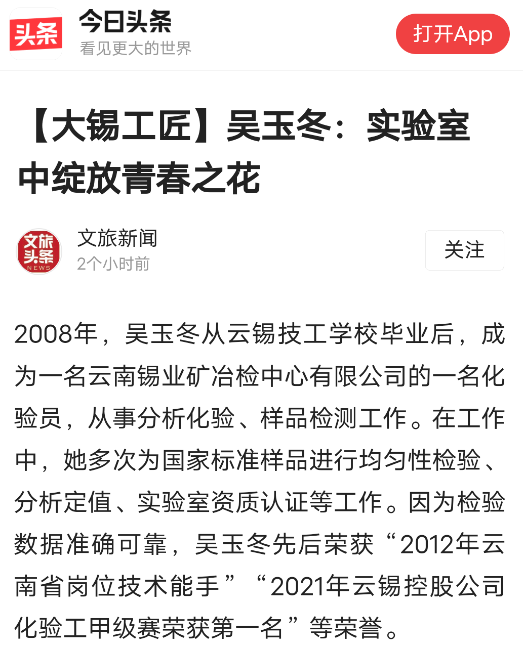 今日头条、百度、文旅头条:【大锡工匠】吴玉冬:实验室中绽放青春之花